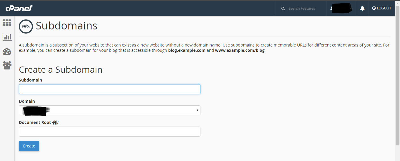 10. Give a sub domain a name . Select the main domain from dropdown. Assign Document Root to public_html/registration/public. As we already know our main project is inside of registration directory. Press the create button. And that's it. our subdomain with project has crated.
